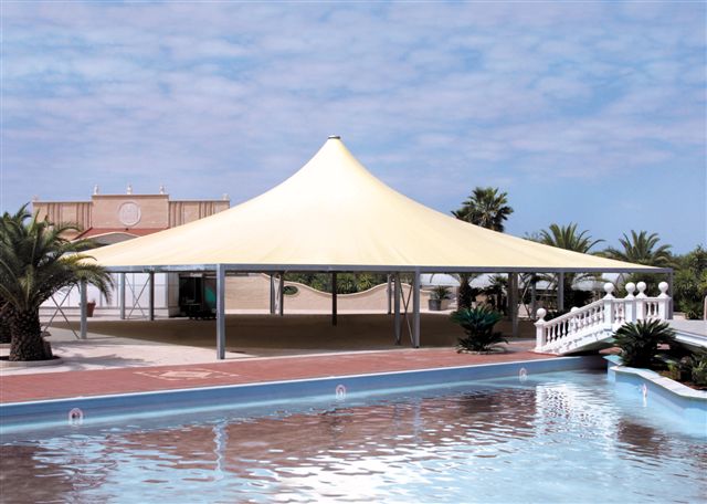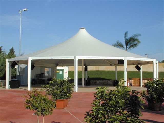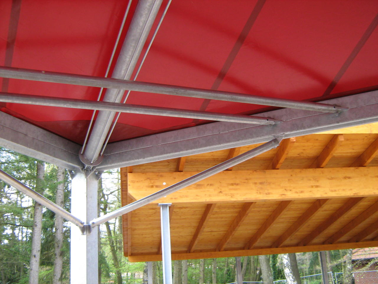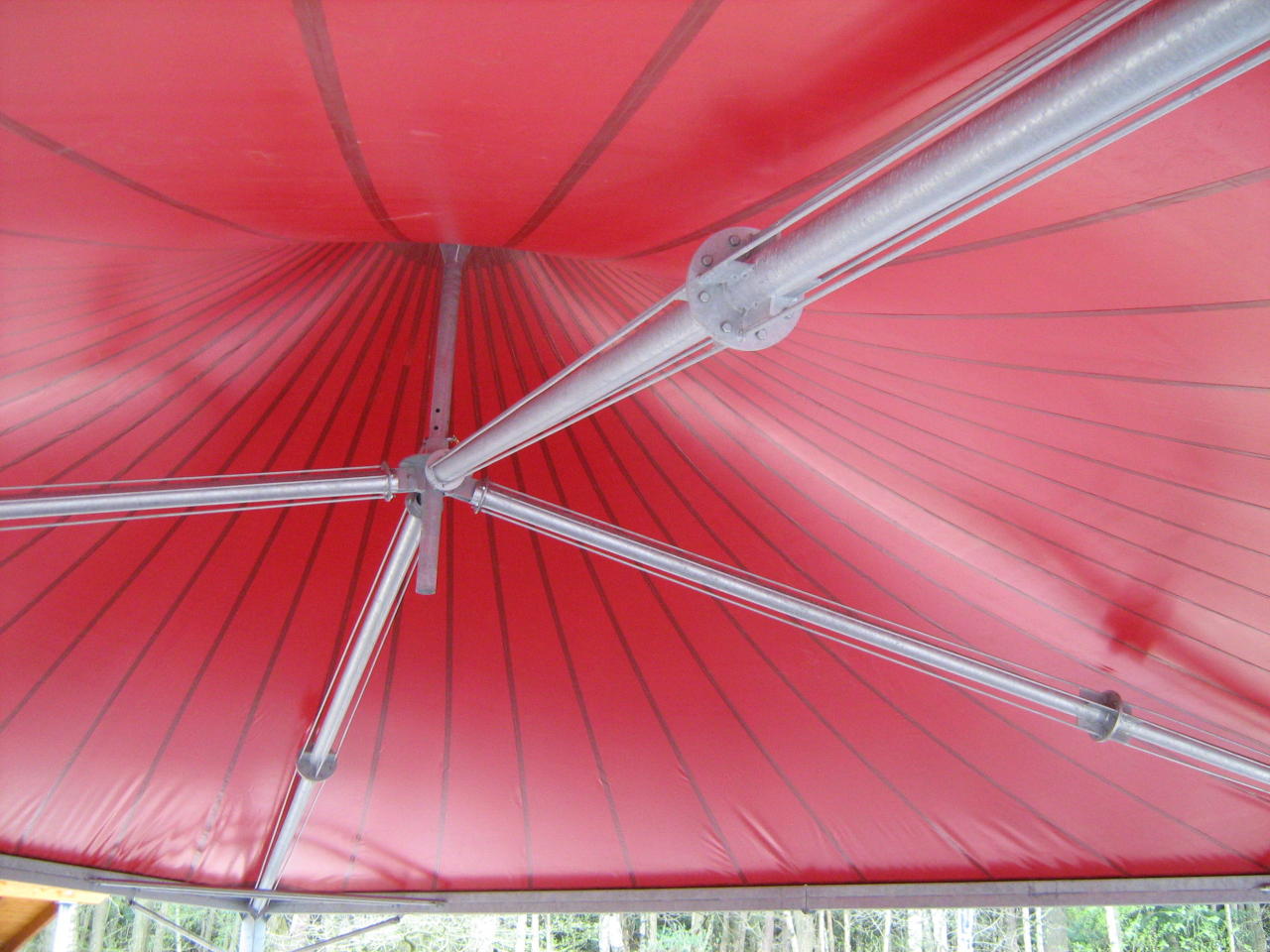 Diese feuerverzinkte, massive Stahlkonstruktion, ist für den ganzjährigen Einsatz gebaut. Das Wasser wird durch eine umlaufende Regenrinne, durch die Fußträger, zum Boden hin abgeleitet. Das Zelt ist für großflächige Überdachungen geeignet und bestens kombinierbar.