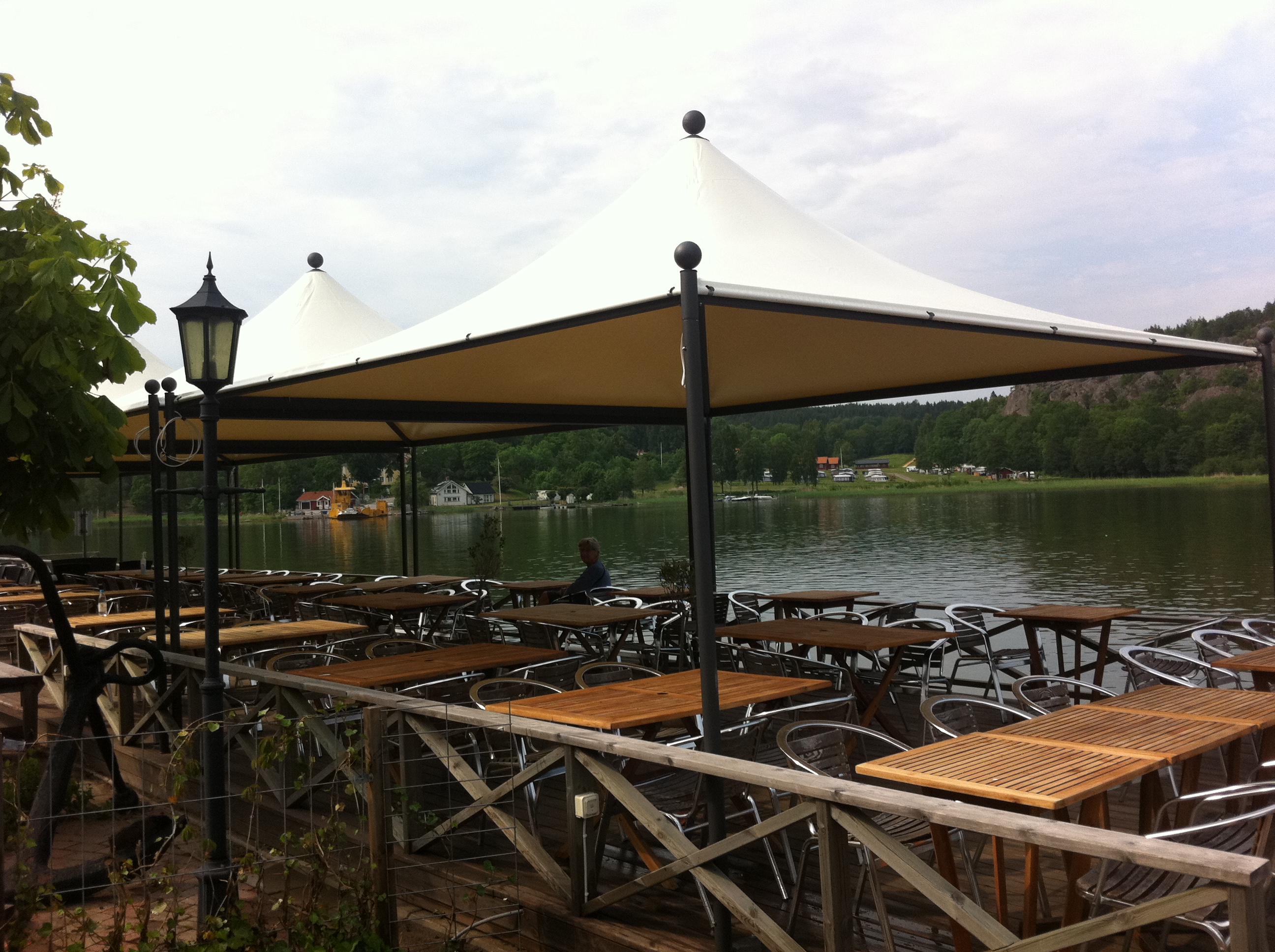 Die Konstruktion besteht aus einem feuerverzinkten Stahlgestänge mit Pulverbeschichtung. Die Plane ist aus einem hochwertigen, hochglanzbeschichteten Hochglanzgewebe und schwer entflammbar.